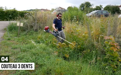 Un couteau 3 dents de grande dimension est fourni de série avec ce modèle, ce qui est un réel avantage car la plupart des concurrents proposent ce type d’équipement en vente additionnelle. On a pu le tester sur de multiples végétaux, telles que les ronces, pourtant plus difficiles à débroussailler.